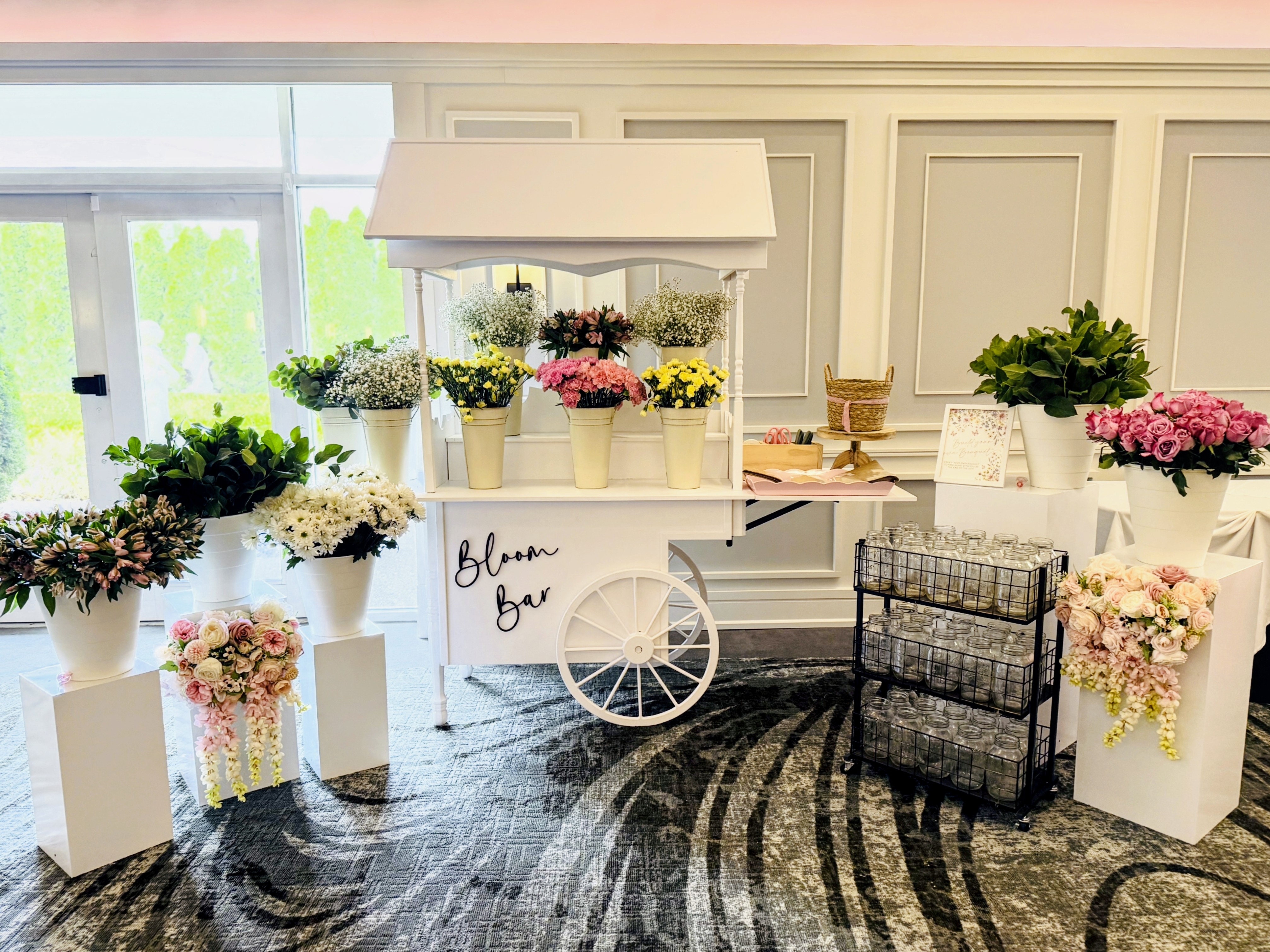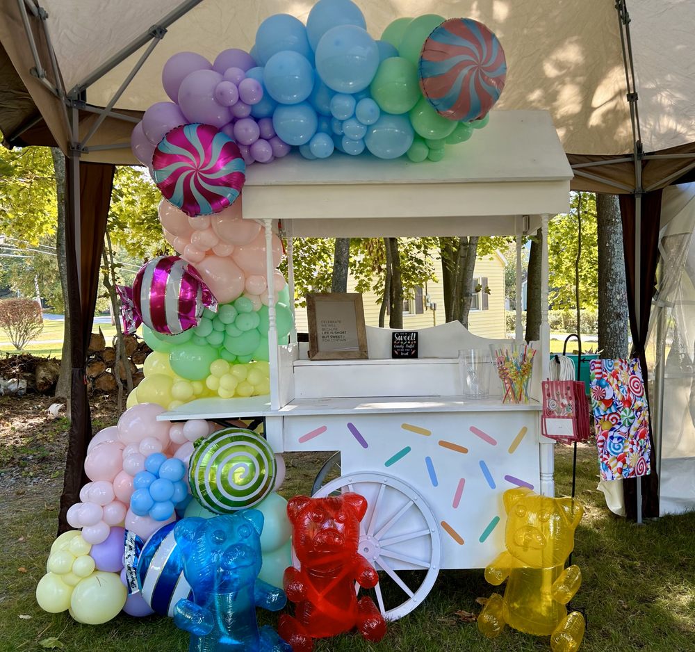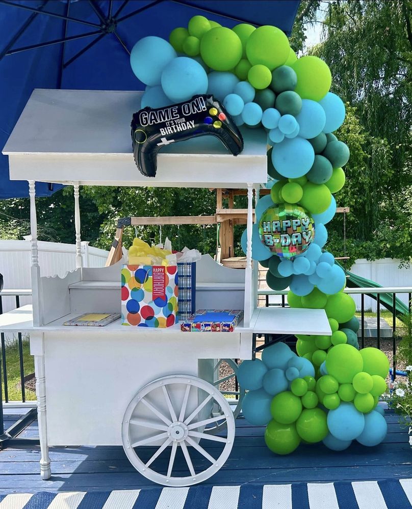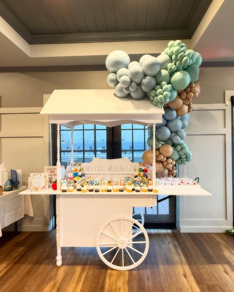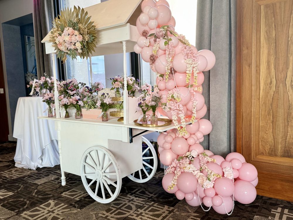 Providing beautifully styled event carts, perfect for creating interactive bloom bars, delightful candy stations, or other unique guest experiences (often adorned with balloons).